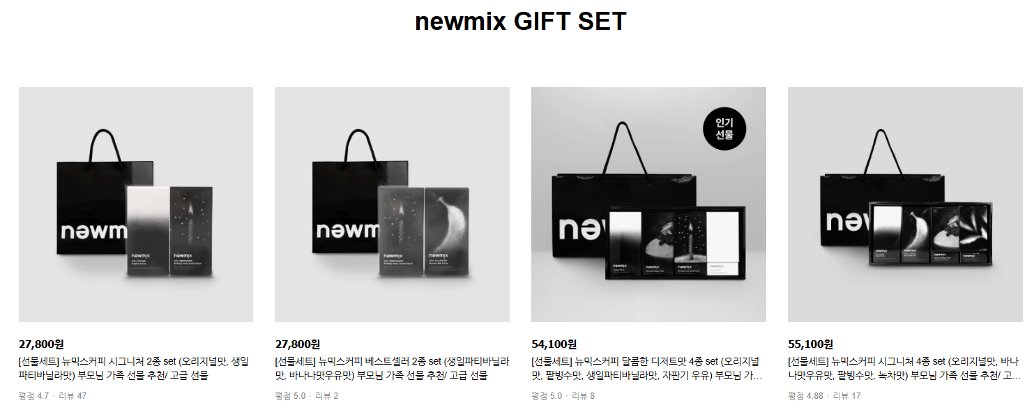 특히 선물용으로 나온 고급스러운 포장은 다양한 이들에게 많은 인기를 누리고 있다고 합니다. 온라인 뉴믹스커피는 온라인 스토어를 통해서 편하게 구매하고 연말 선물에 활용해보세요.