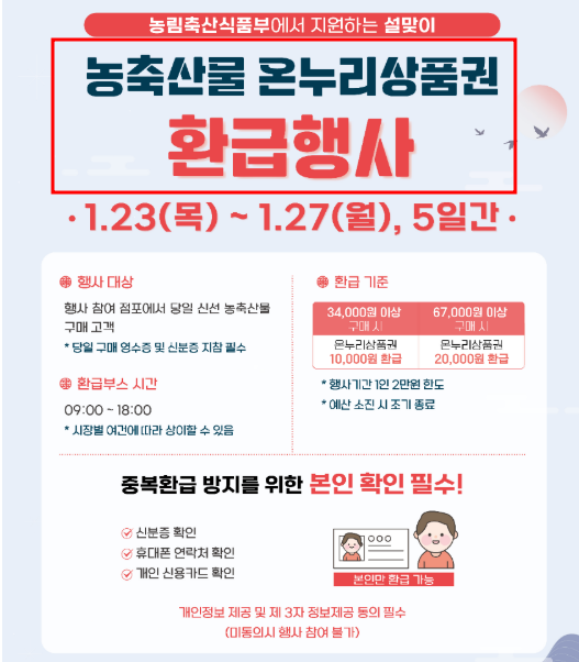다가오는 설 명절을 맞아 농축산물과 수산물을 더 알뜰하게 구매할 수 있는 특별한 이벤트가 열립니다. 농림축산식품부와 해양수산부에서 지원하는 이번 온누리상품권 환급 행사는...!