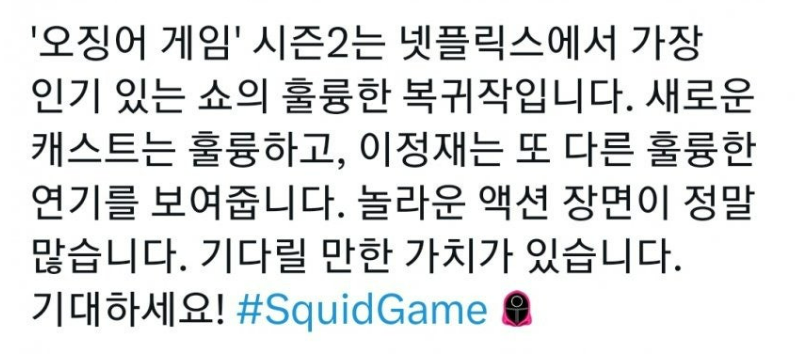 이와 같이 다양한 평론가들이 오징어게임 시즌2에 대한 찬사를 쏟아내고 있습니다. 이번에는 액션 장면이 더더욱 가미가 되었다고 하는데 어떤 장면들일지 벌써부터 기대가 됩니다.